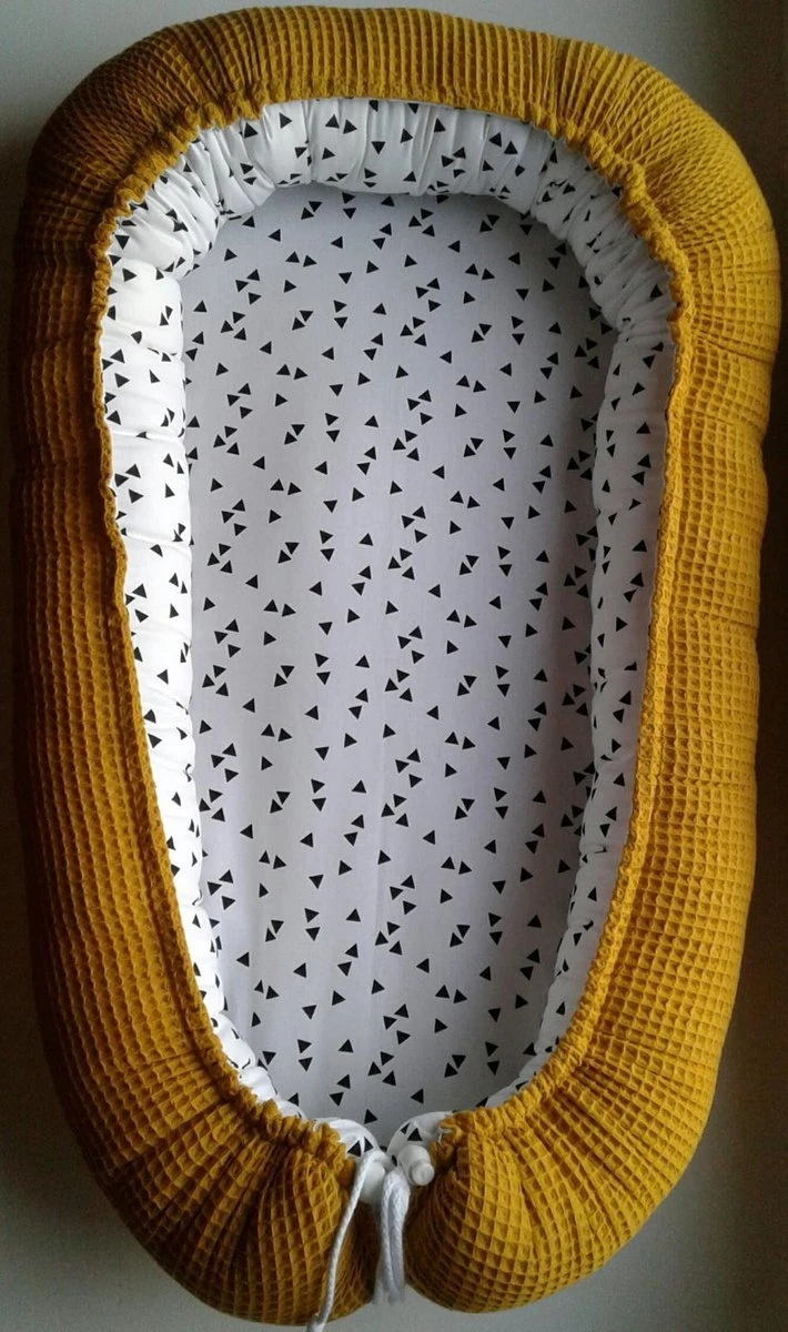De buitenkant is gemaakt van zachte wafelstof (oker), met aan de binnenkant een lief katoentje (wit met zwarte driehoekjes) De lengte van het matrasje is 60 cm.
