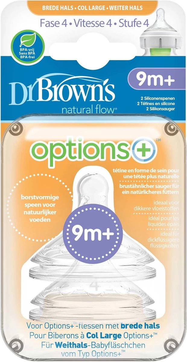 Dr. Browns Flesspeen Brede Hals Fase 4. Deze speen is geschikt voor kindjes vanaf ongeveer 9 maanden. De speen is bedoeld voor pap en dikkere voeding. Bijvoorbeeld voeding op basis van johannespitmeel. Ook geschikt voor kindjes die snel of gulzig eten.De spenen van Dr. Browns zijn gemaakt van zeer zachte, klinisch geteste siliconen. Door de speciale vorm en de zeer zachte textuur ligt de speen perfect in je babys mond. Er zijn verschillende flesspenen van Dr. Browns te verkrijgen. Het verschil zit in de snelheid waarmee de voeding doorstroomt en de leeftijd van je kleintje. Vervang spenen elke zes weken of eerder als er tekenen van slijtage zijn. Alleen geschikt voor Dr. Browns Options+ Anti-colic brede halsfles.