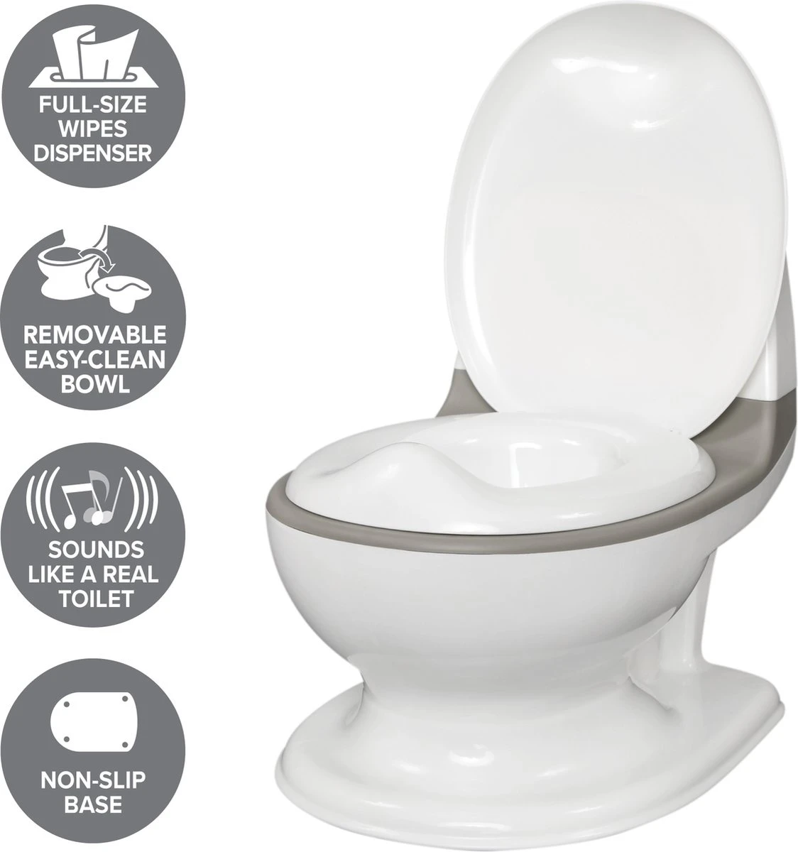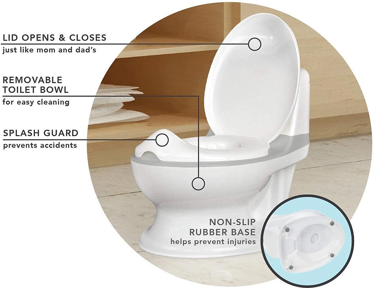 Het peuterpotje met doorspoelgeluid is de perfecte oplossing voor een peuters toilettraining. Enkele van de vele fantastische kenmerken zijn: een levensecht doorspoelgeluid van een toilet, een wc-bril die opent en sluit, en een geïntegreerde spatbescherming die effectief blijft zitten. Daarbovenop beschikt het over een bakje achteraan waar babydoekjes kunnen worden ingestoken en dat vastklikt. Het heeft een anti-slip rubberen basis zodat het niet kan wegslippen terwijl er een trainingsessie aan de gang is, en het potje is verwijderbaar om erg makkelijk schoon te maken. Elk kind is natuurlijk anders, maar wat betreft het starten van potjestraining kan je erop vertrouwen dat peuters makkelijker en sneller vertrokken zullen zijn met dit draagbare toiletje aan hun zijde!