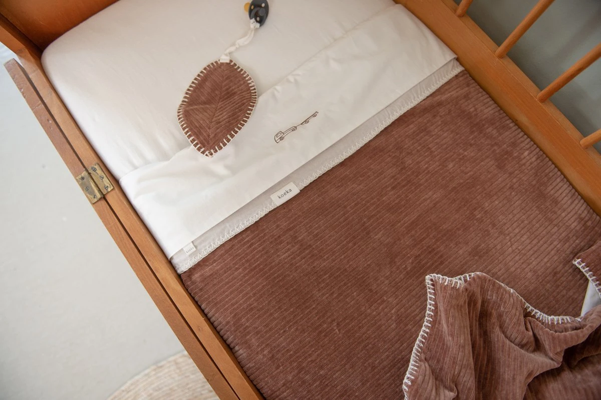 Deze wiegdeken is gemaakt van corduroy en gevoerd met flanel. De lijnen en het reliëf van de stoer toegepaste corduroy doet denken aan het bergachtige landschap van Vik. Maar hoe ruig de bergen in IJsland ook zijn, de stof is daarentegen super zacht en knuffelbaar.