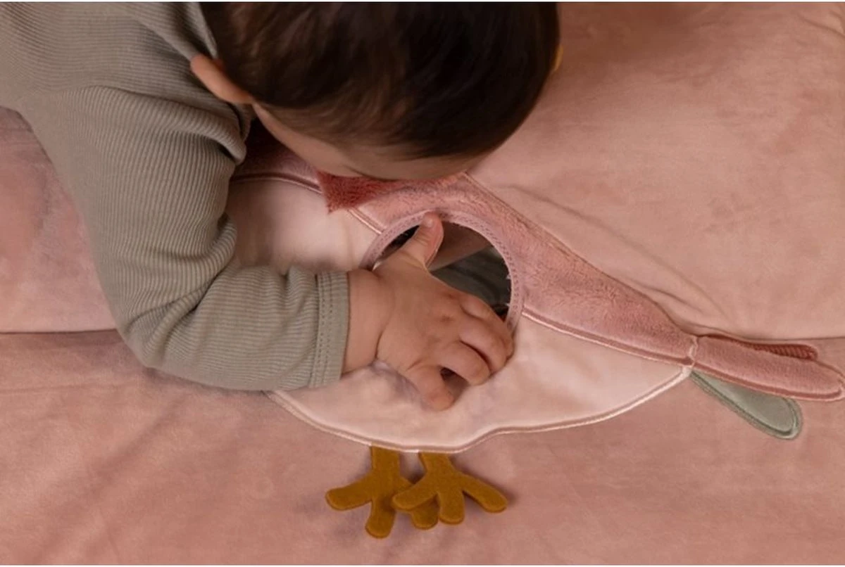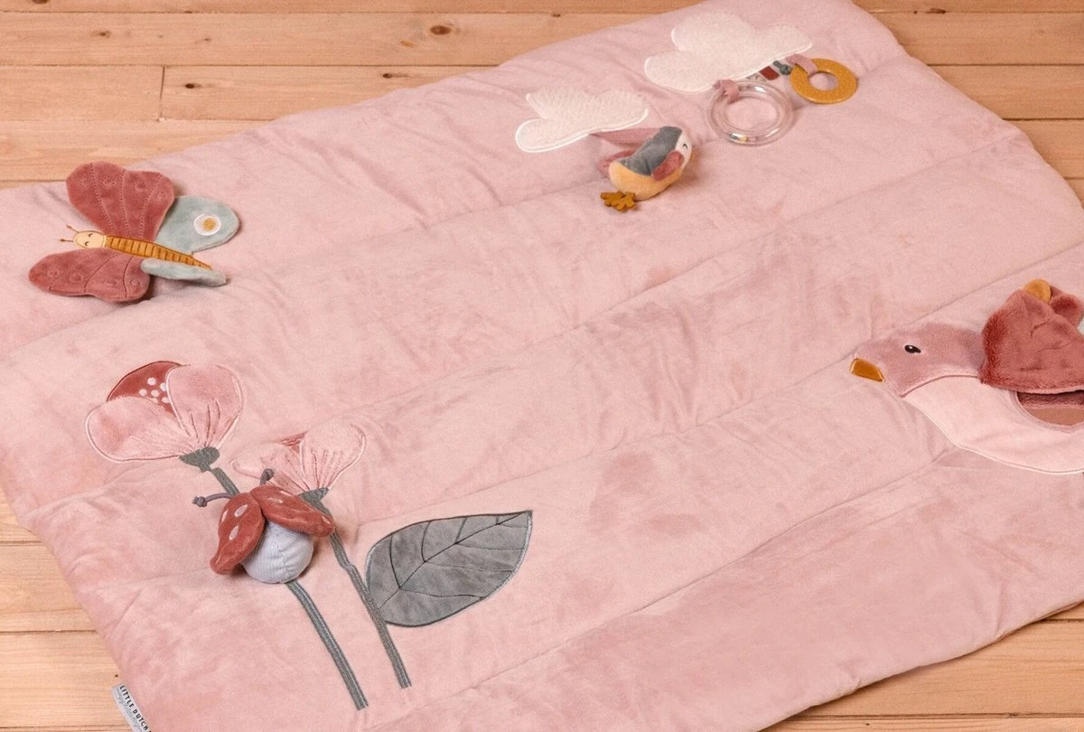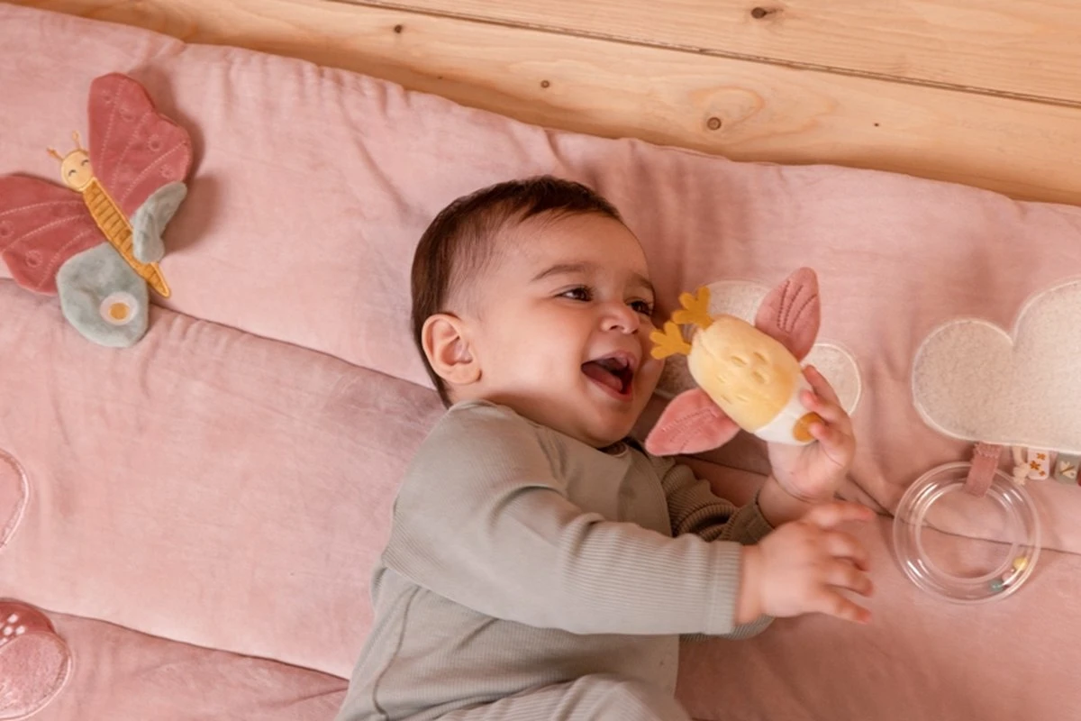 Op verkenning in het bloemenweide. Dit gewatteerde boxkleed zal de zintuigen van je kindje stimuleren met dank aan de vele verschillende texturen en activiteiten. Er valt zoveel te zien en te ontdekken voor kleine ontdekkingsreizigers. De roze vlinder heeft leuke, gekreukte vleugels en het kleine musje begint te rinkelen als je baby met haar speelt. Het boxkleed is daarnaast voorzien van een spiegeltje en beschikt over een transparante ring met 3 kleine kraaltjes die rammelen als ze verplaatsen.
