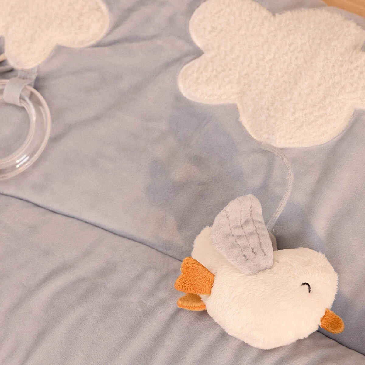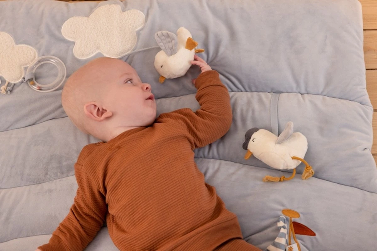 Kleine handjes, grote ontdekkingen. Dit zachte, op de haven geïnspireerde boxkleed stimuleert met verschillende texturen en activiteiten de zintuiglijke ontwikkeling. Je kindje zal de ene na de andere leuke verrassing ontdekken. Van een zeemeeuw die piept als er in hem genepen wordt, tot een pelikaan met knispervleugels en een visje in zijn snavel. Een van de wolkjes heeft een doorzichtige ring die rammelt als je baby ermee speelt. En achter het gestreepte zeil van de zeilboot is een spiegeltje voor zelfontdekking verstopt.