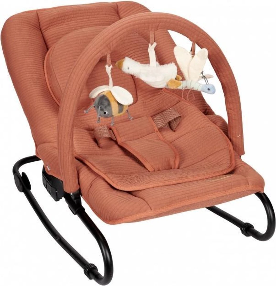 De wipstoel wordt geleverd inclusief speelboog met 3 leuke speeltjes van Little Dutch.