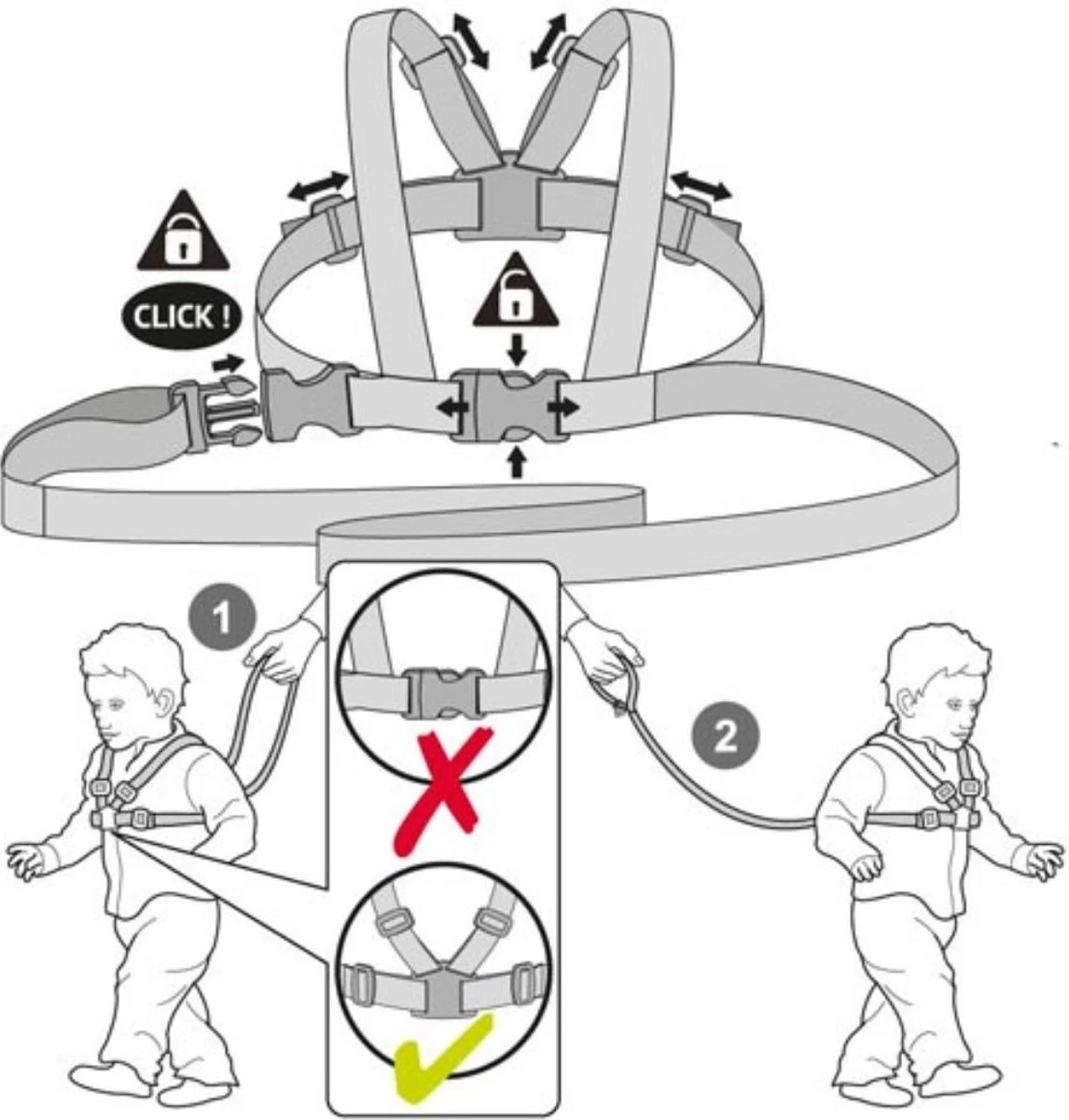 Het harnasje is volledig verstelbaar en geschikt voor kinderen van ca. 6 maanden t/m 4 jaar. De schouderriempjes en het riempje rondom de borst zijn heel makkelijk op de juiste maat in te stellen.