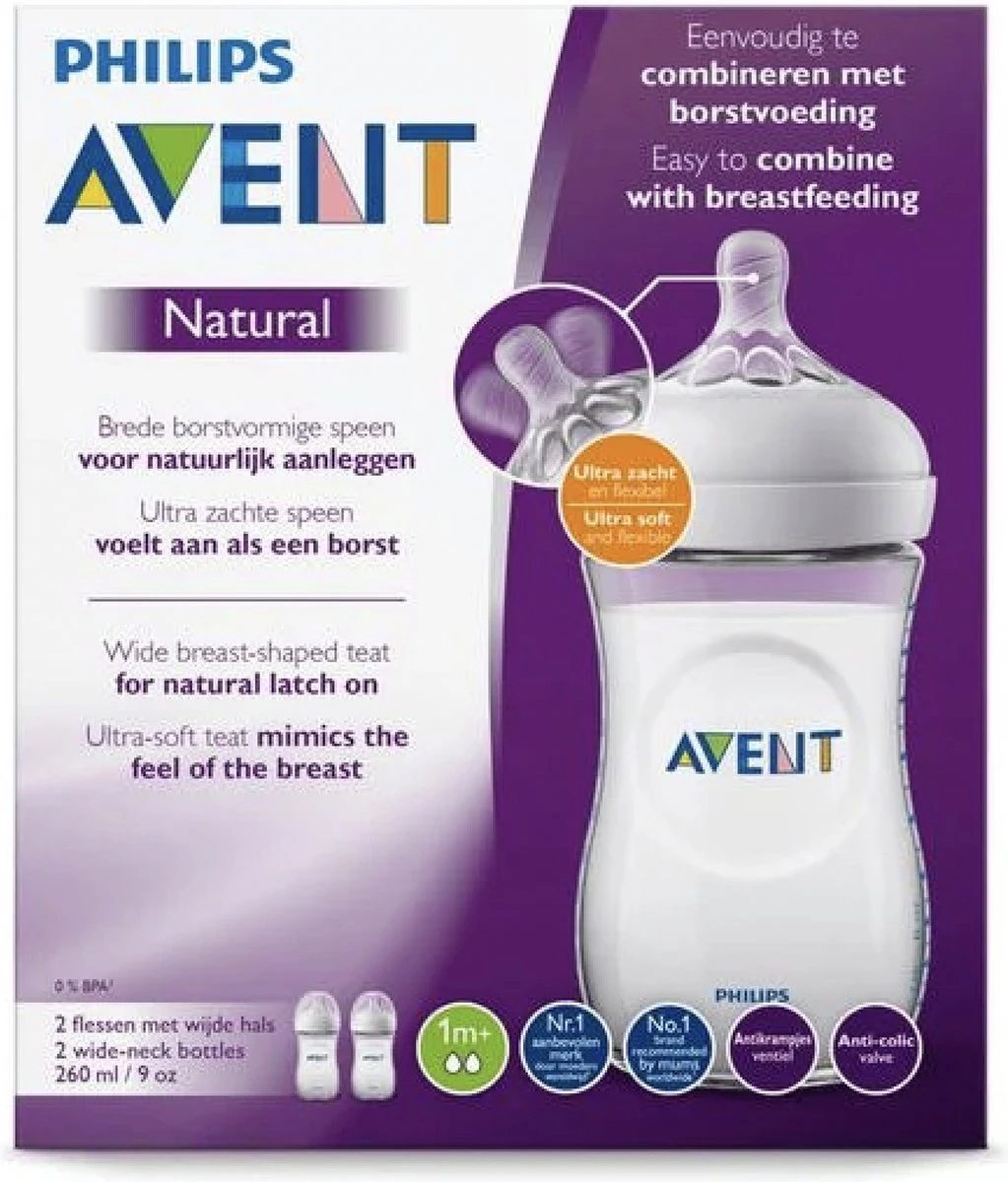 De Philips Avent Natural voedingsfles SCF033/27 is de meest natuurlijke manier om flesvoeding te geven. Door de brede vorm van de speen, die lijkt op de vorm van een borst, wordt natuurlijk aanleggen gestimuleerd. Dit maakt deze voedingsfles ook makkelijk te combineren met borstvoeding. Zo geniet je baby van alle voordelen van moedermelk, ook al ben je er niet. De voedingsspeen is voorzien van een flexibel en spiraalvormig design met unieke comfortkussentjes die zorgen voor een natuurlijke manier van voeden, zonder dat de voedingsspeen inklapt. Tevens is de voedingsfles zo ontworpen dat de lucht uit de maag van je baby wordt gehouden wat darmkrampjes en andere ongemakken tijdens het voeden helpt verminderen.