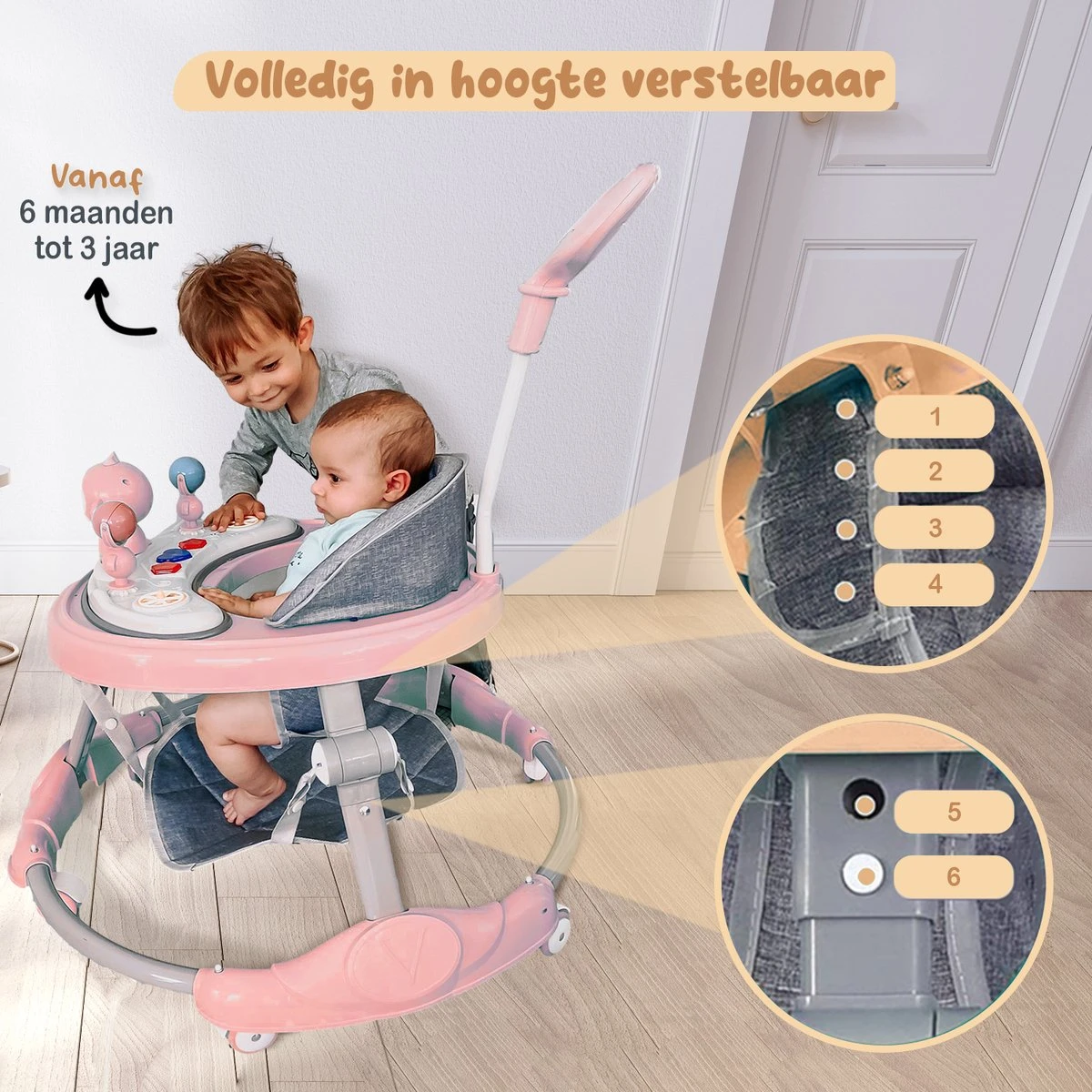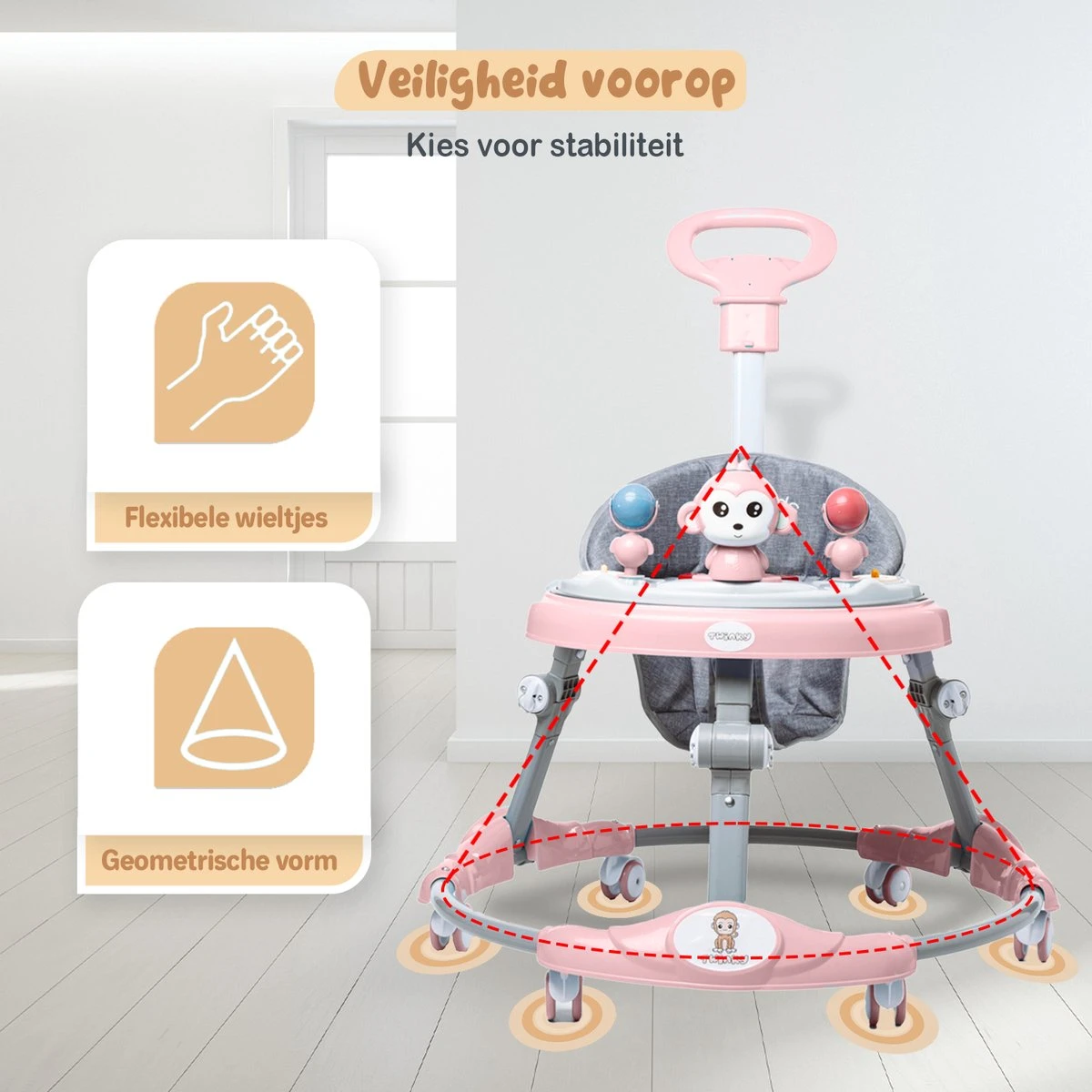 Deze slimme loopstoel is voorzien van 6 flexibele wieltjes zodat je kleintje zonder blokkades de wereld kan ontdekken!