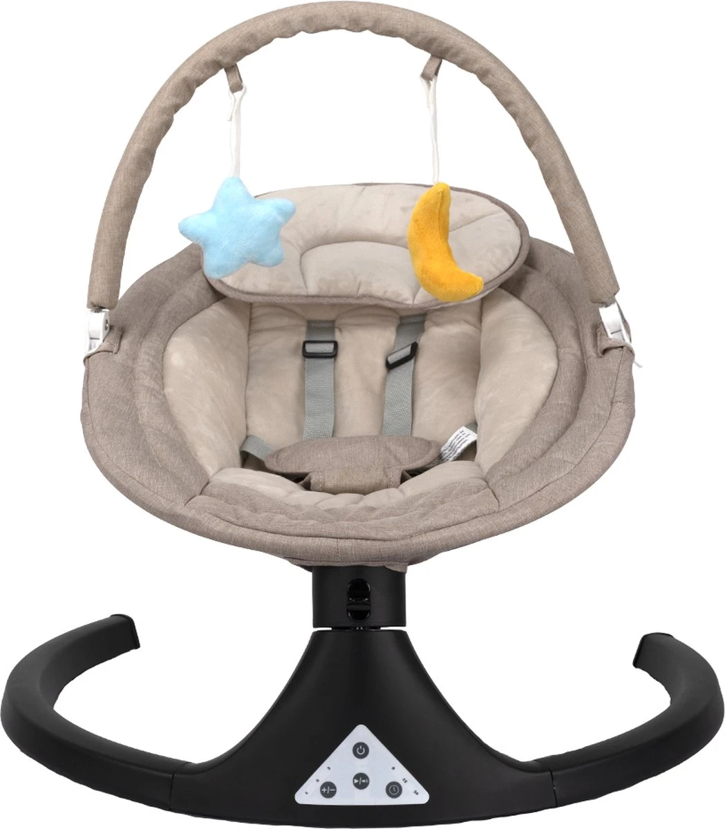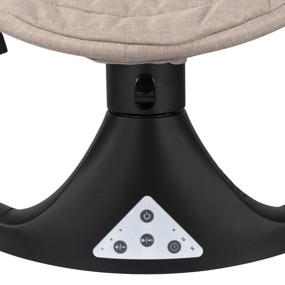 De wipstoel is aanstuurbaar met zowel een afstandsbediening als de interactieve display op de swing zelf. De wipstoel is namelijk voorzien van verschillende schommelstanden. Je kunt de wipstoel een duwtje geven en dan wiegt deze na tientallen seconden rustig uit. Je kunt de wipstoel ook elektrisch aandrijven, en dan zijn er 5 verschillende standen beschikbaar. Stand 1 is heel rustig heen en weer wiegen in een kleine hoek. Stand 5 schommelt jouw kindje sneller en vanuit een grotere hoek. Daarnaast kun je met de afstandsbediening een heerlijk muziekje voor jouw kindje opzetten, met keuze uit wel 12 melodieƫn, waaronder pianomuziek en natuurgeluiden. De wipstoel wordt geleverd inclusief adapter.